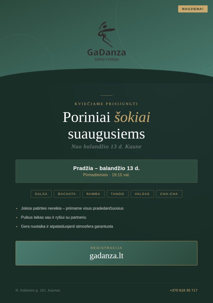 📍 Vieta: šokių studija GaDanza – R. Kalantos g. 161, Kaunas